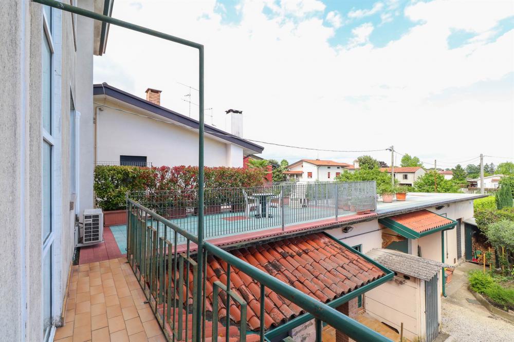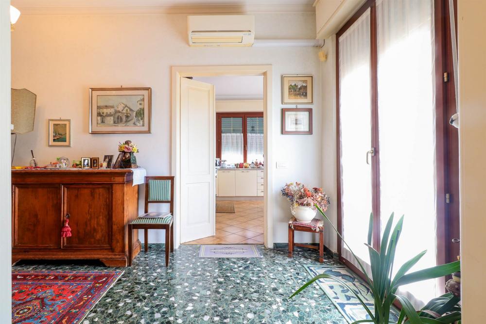 Finiture in legno nella zona notte e in soggiorno, veneziana in ingresso e in grès in cucina.
